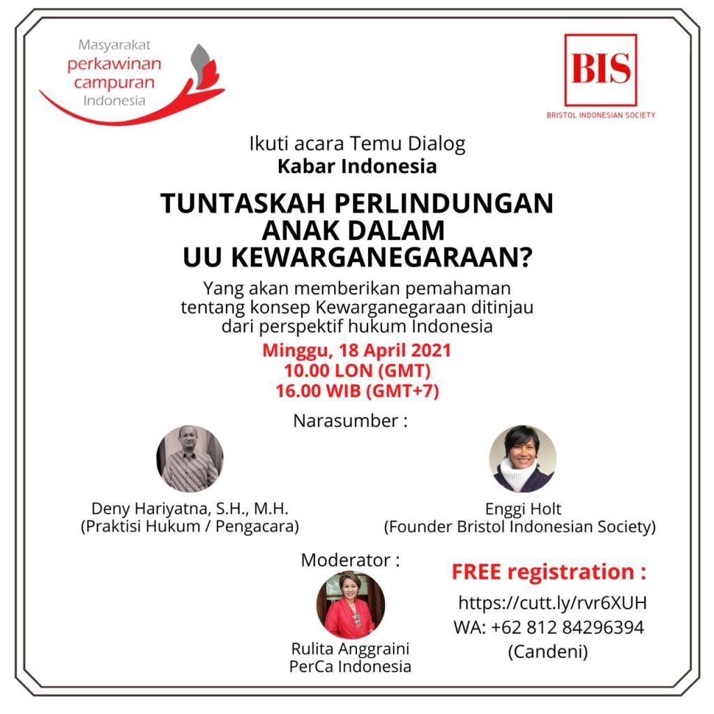Dialog ini adalah bagian dari serangkaian kegiatan daring Bristol Indonesian Society bekerjasama dengan PerCa Indonesia yang dirancang guna menjawab pertanyaan Diaspora Indonesia mengenai Keimigrasian, Harta Perkawinan, Warisan dan pada Minggu tanggal 18 April 2021, pukul 10 waktu London/ 16.00 WIB waktu Jakarta Temu Dialog Kabar Indonesia akan berdialog tentang anak.